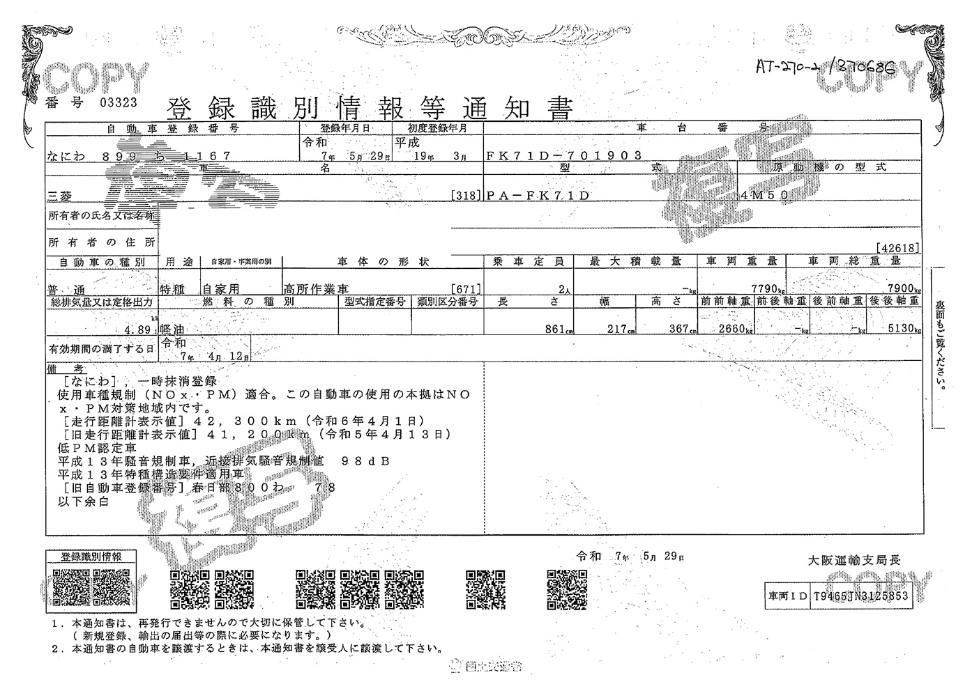 Specifications - Lot : 8258010 AT-270-2 (PA-FK71D)