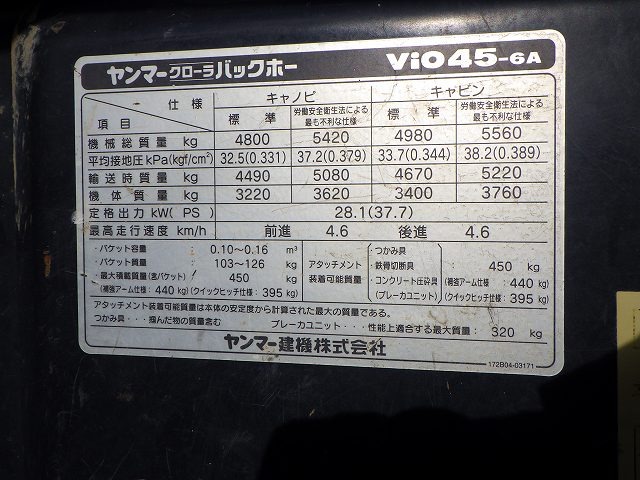 Specifications - YANMAR VIO45-6A